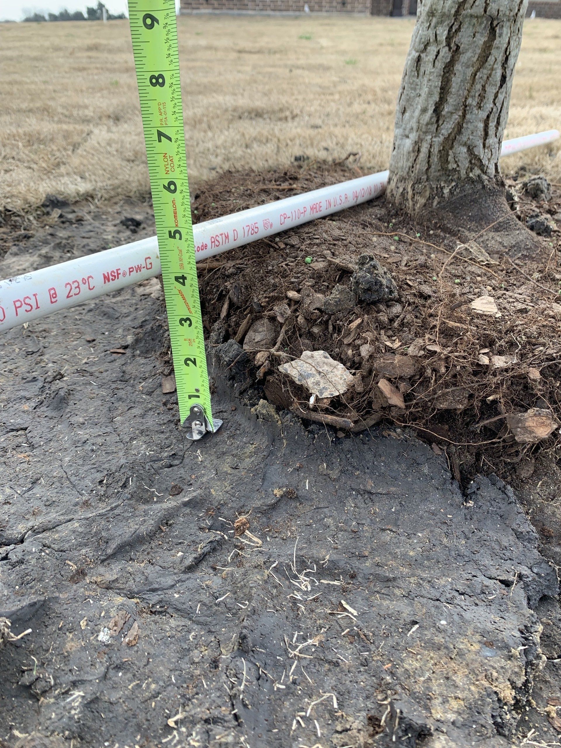 is installed 4"- 6" generally above the soil line - All soil is removed away from the flare of the tree. Flare is fully exposed